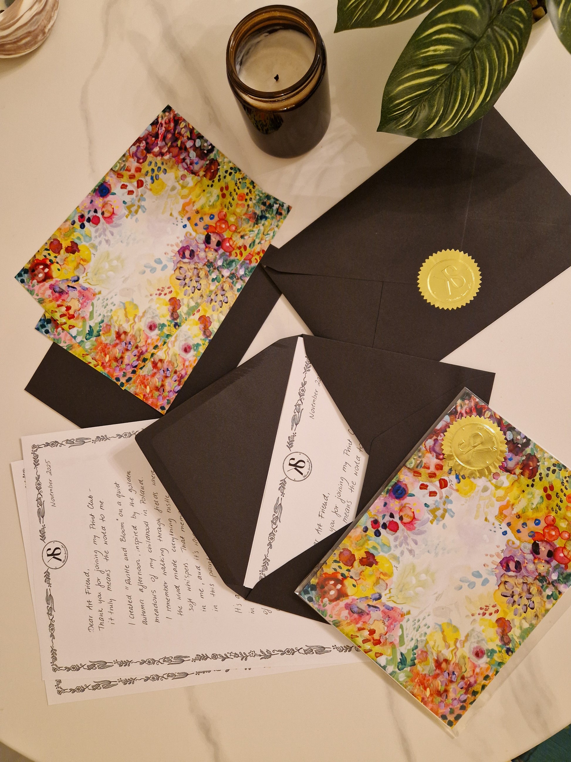 Each month, you’ll receive a 148x210 mm (A5) / 5.8x8.3 inch, hand-selected, artist-signed art print delivered straight to your mailbox together with a handwritten letter (in your chosen language) telling a story behind the painting.